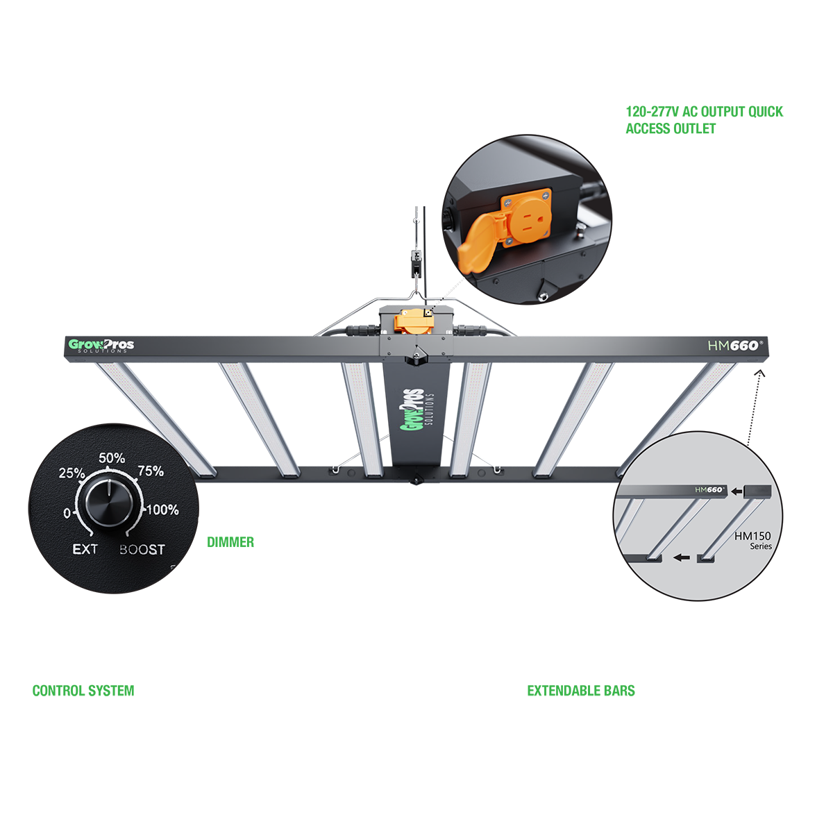 The HM660 lighting system is a complete, pre-assembled LED grow light that lowers installation time with a wide range of wiring techniques and connectors. It runs with a passive cooling thermal management system, meaning your lighting systems last longer while retaining high light output levels. Longer lifespan means you can grow crops for many years without needing to replace the lighting system, reducing costs. Indoor plants grow best under full-spectrum lights, which replicate the natural spectrum of the sun. The HM660 Series, with an increased lifespan over traditional grow light sources, cultivates healthier, happier plants.