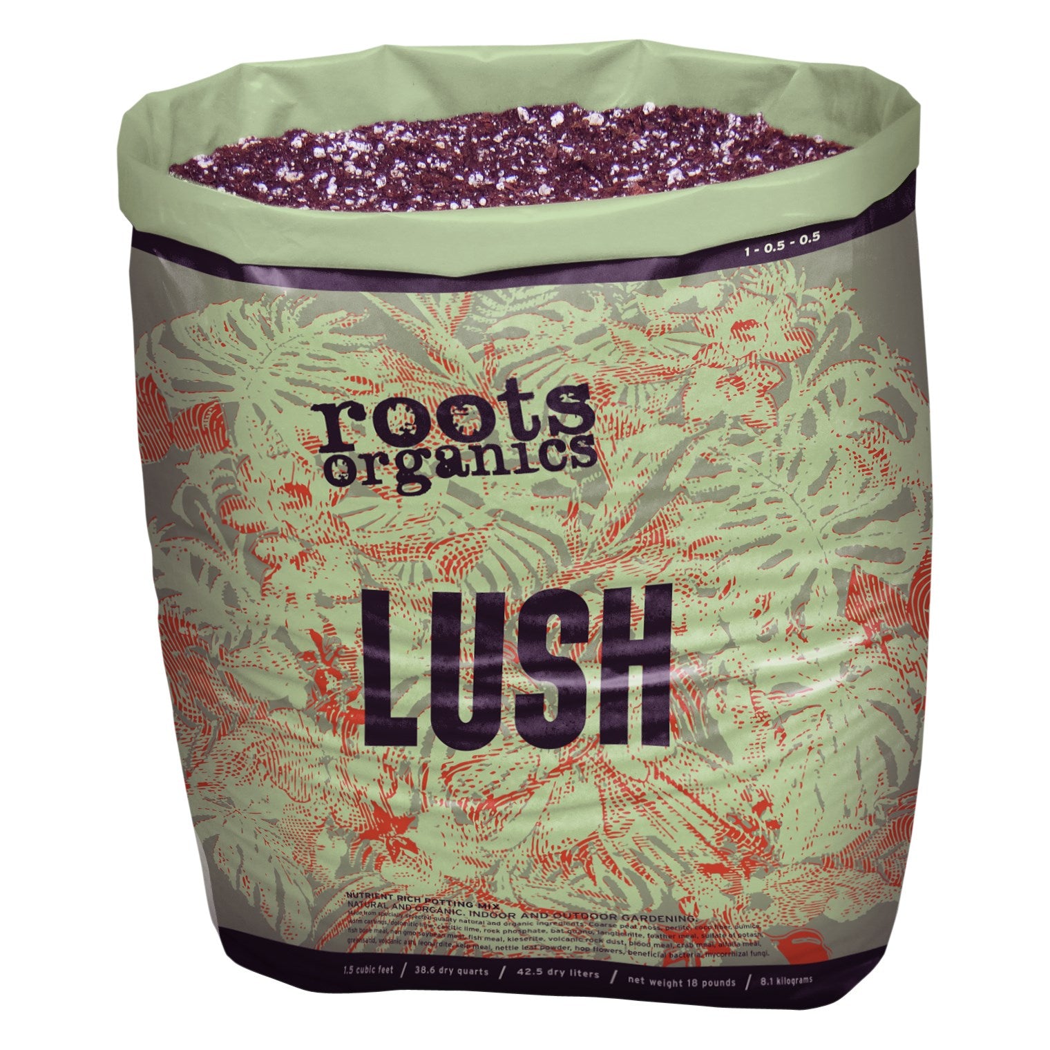 Roots Organics Lush growing mix is an amended peat-based media that delivers absolute consistency and control. What makes Lush superior to the competition? Nutrient-rich, this robust mix combines a well-measured primary fertility package with ideal foundational components to maximize yield in mature flowering plants. The precise ratio of peat, coir, perlite, pumice and worm castings has been added to create ideal water holding capacity and drainage. Rich in sustaining nutrients, this media is designed for a water-only or reduced nutrient schedule. In fact, most plants can happily feed on Lush for up to eight weeks without additional support. Roots Organics Lush is ideal for the gardener who wants a heavily amended soil packed with the best natural and organic nutrients on earth. Derived from Earthworm castings, dolomite, limestone, phosphate rock, bat guano, langbeinite, feather meal, sulfate of potash, fishbone meal, soybean meal, fish meal, kieserite, volcanic rock dust, blood meal, crab meal, alfalfa meal, greensand, volcanic ash, kelp meal, nettle leaf and hop flowers. Soil Amending Ingredients: Peat moss, earthworm castings, pumice, perlite, and coco fiber